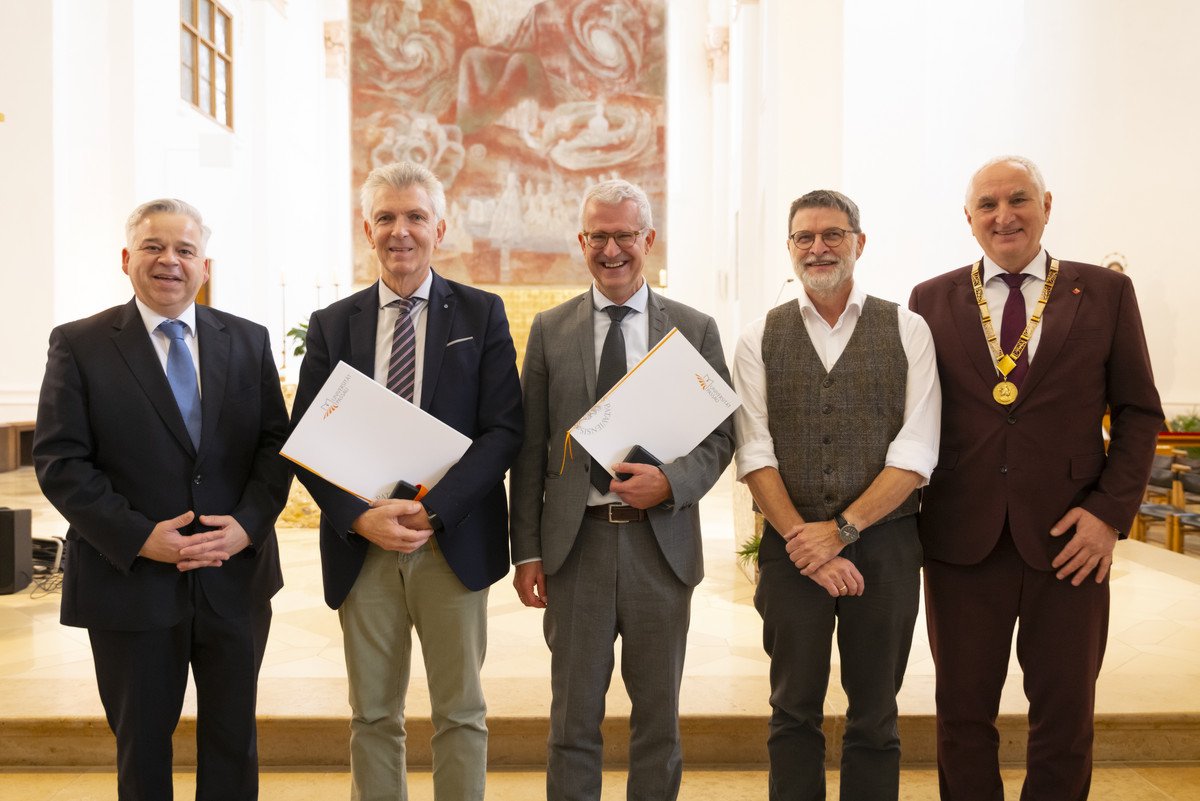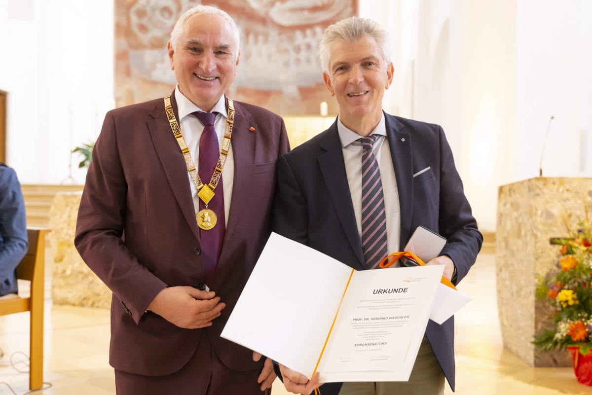 Zudem verlieh der Präsident die Ehrensenatorenwürde an den Vorstandsvorsitzenden des Neuburger Gesprächskreises Dr. Fritz Audebert und an den ehemaligen Landtagsabgeordneten und langjährigen Unterstützer der Universität Passau Prof. Dr. Gerhard Waschler. In Abwesenheit als Ehrenbürger der Universität geehrt wurde außerdem der ehemalige Landtagsabgeordnete Walter Taubeneder.