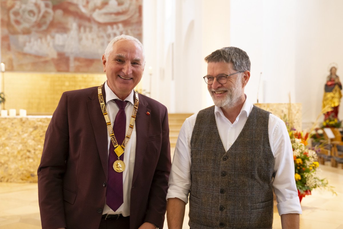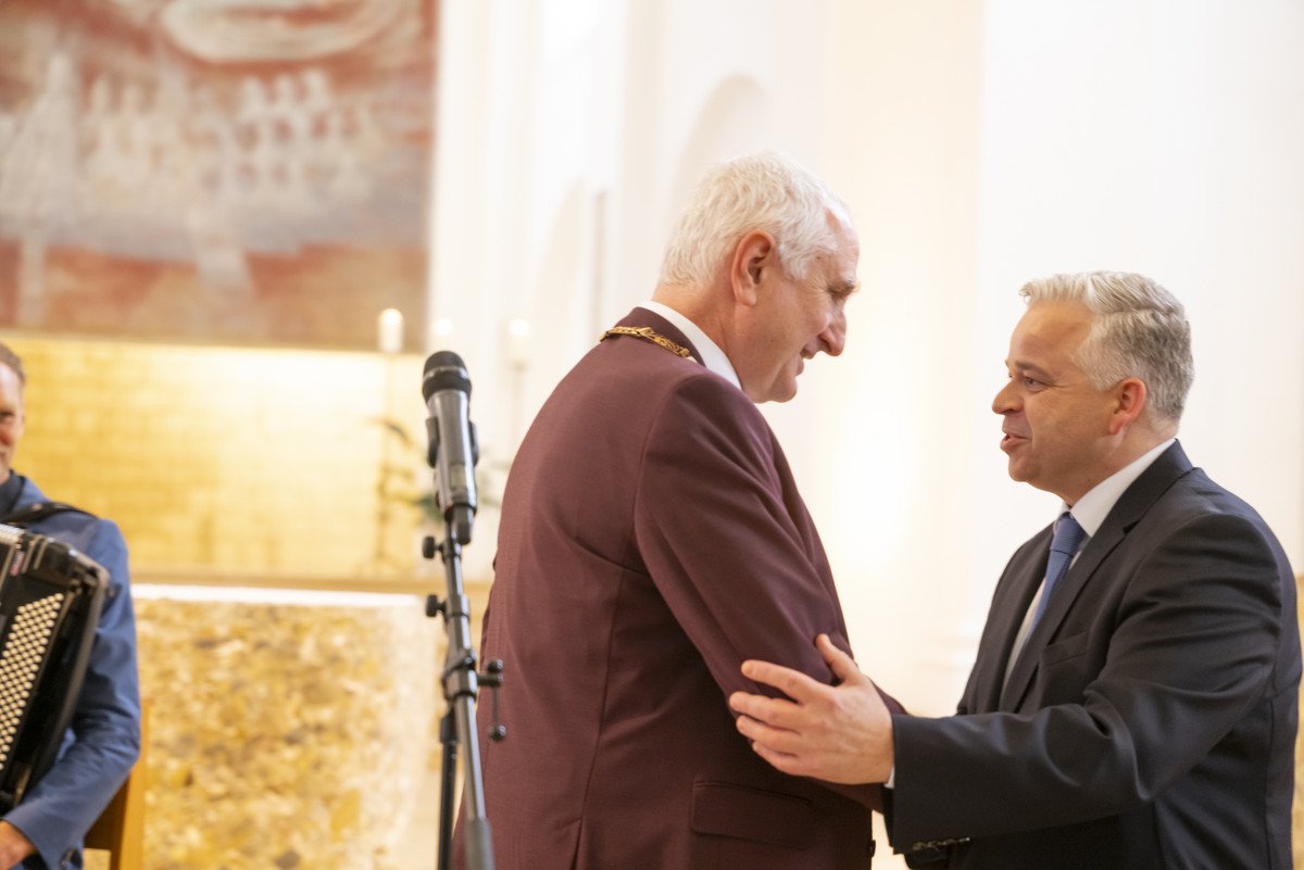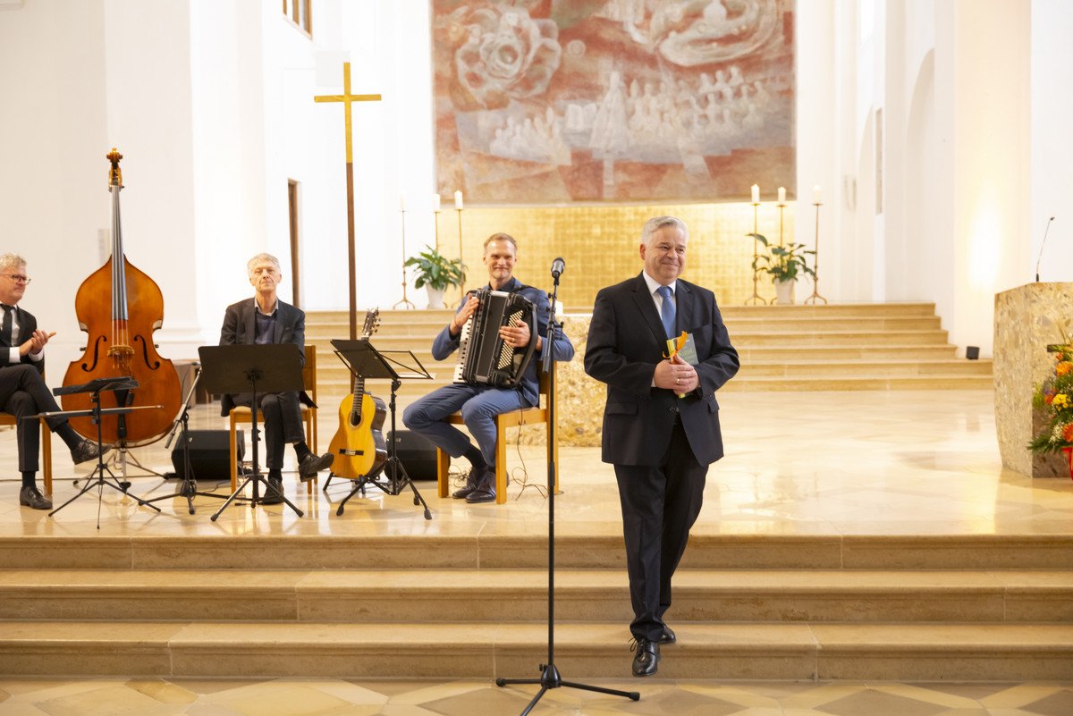 Den stimmungsvollen Auftakt des diesjährigen Dies academicus der Universität Passau bildete eine Feierstunde in der Kirche St. Nikola, musikalisch umrahmt vom Trio Daniel Eberhard. Präsident Prof. Dr. Ulrich Bartosch verabschiedete sich im Namen der gesamten Universitätsfamilie von Kanzler Dr. Achim Dilling, der zum Jahresende die Universität Passau verlassen wird. „Wir danken ihm für seinen Dienst, seine Visionen und seine Umsetzungskraft“, so Bartosch. „Strategische Weitsicht, Verwaltungskompetenz und gesellschaftliches Engagement ließen ihn an der Universität, in Stadt und Region erfolgreich wirken.“