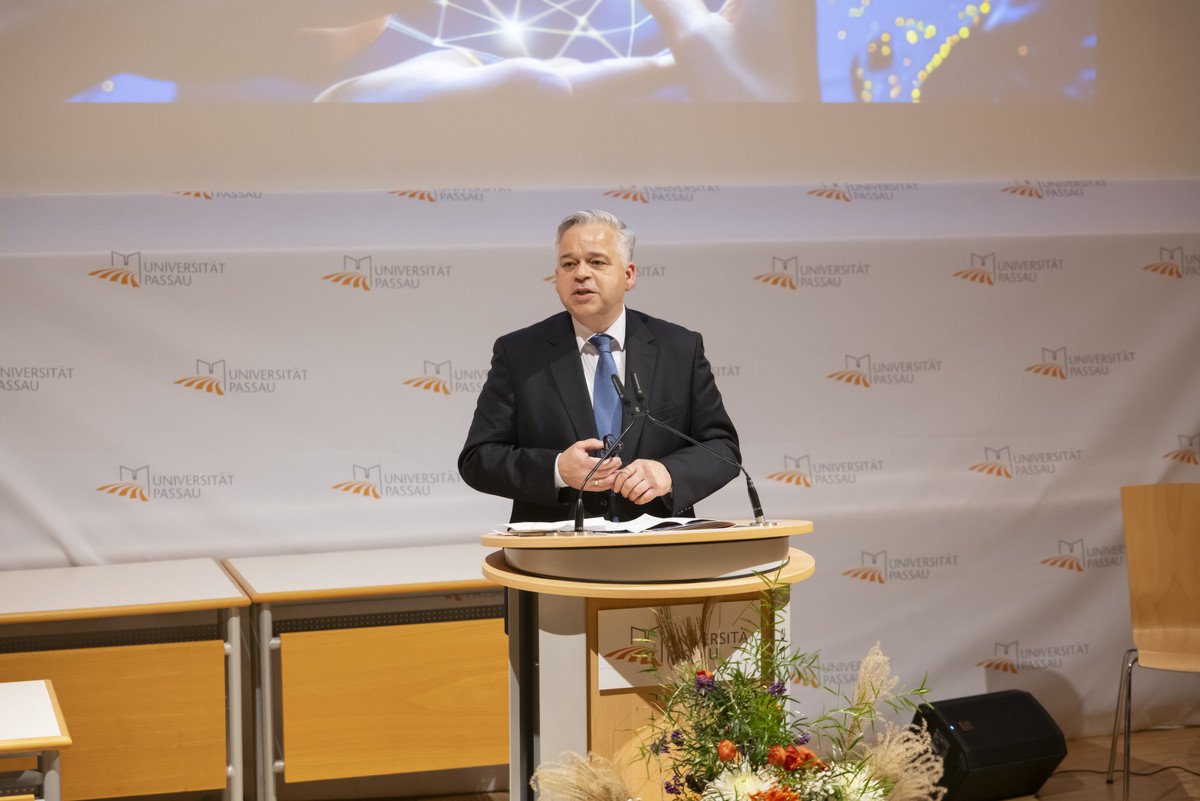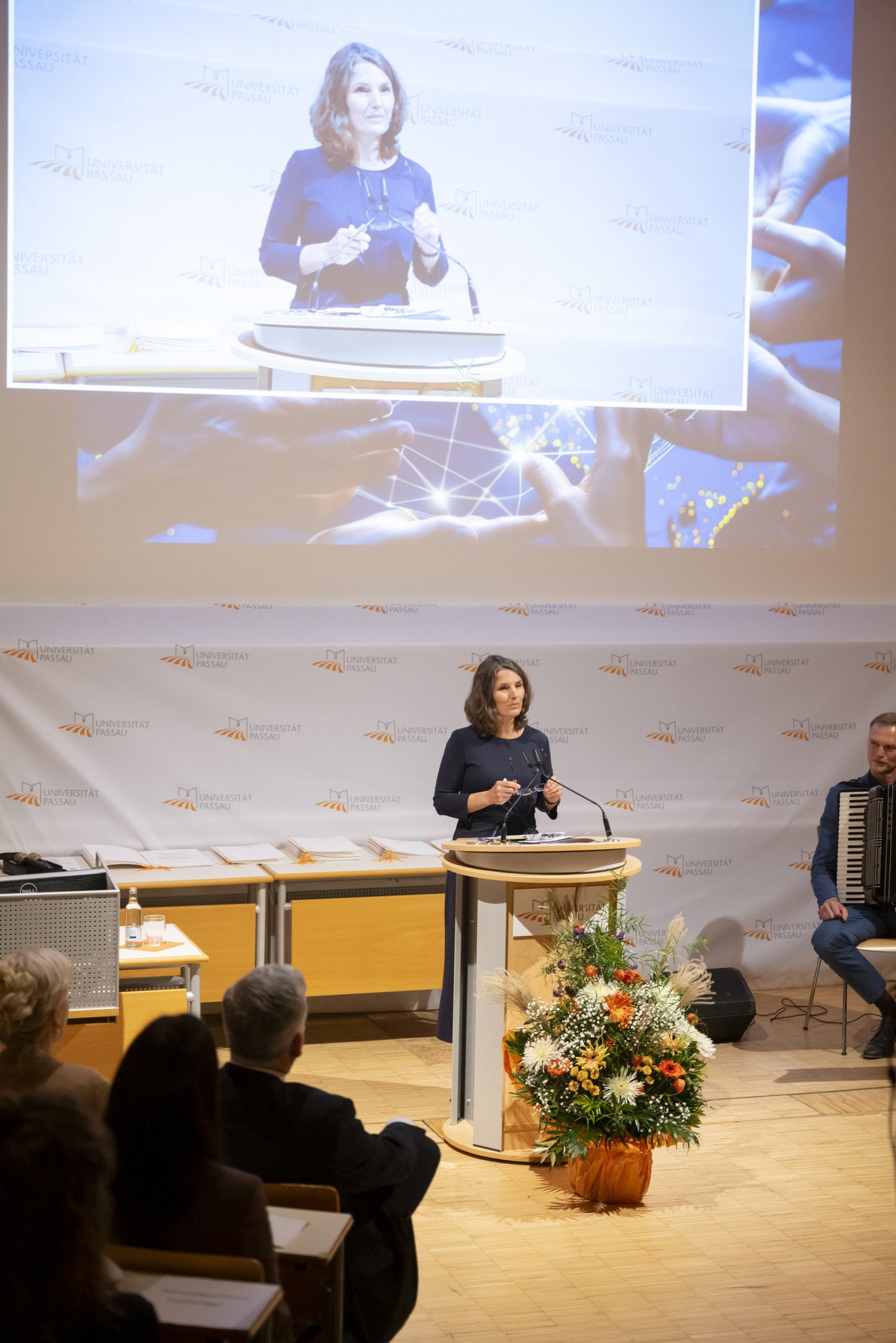 Die Festrede hielt in diesem Jahr die Abteilungsleiterin für Cyber- und Informationssicherheit im Bundesministerium des Innern, Friederike Dahns. Die Alumna der Universität Passau sprach zum Thema „Cybersicherheit als gemeinsame Aufgabe – Wissenschaft, Staat, Wirtschaft und Gesellschaft im digitalen Zeitalter“. Die Frage der Cybersicherheit sei keine rein technische Frage, so Dahns. „Technische Entwicklungen wie die Nutzung von KI und Drohnen werfen auch ethische Fragen auf und für deren Beantwortung ist die Verknüpfung mit anderen Disziplinen notwendig.“ Der Schatz der Universität Passau sei die Interdisziplinarität. „Die interdisziplinär angelegten Studiengänge befähigen Studierende dazu, über den Tellerrand einer gewählten Fachdisziplin hinaus Wissen zu verknüpfen und Problemlösungen sowie Transformationsprozesse aus unterschiedlichen Perspektiven zu denken.“