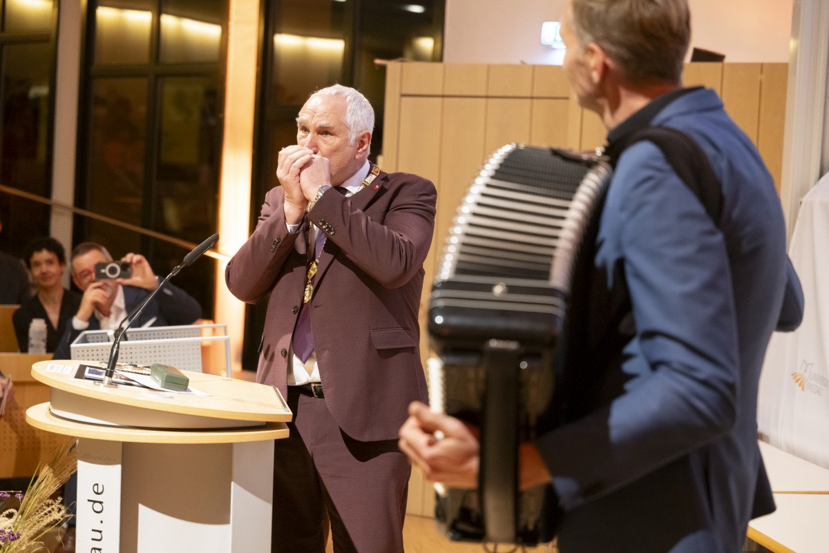 Den feierlichen Abschluss des Dies academicus 2025 bildeten eine kurze Würdigung der zuvor ernannten neuen Ehrensenatoren der Universität Passau Dr. Fritz Audebert und Prof. Dr. Gerhard Waschler sowie die Verabschiedung von Kanzler Dr. Achim Dilling vor großem Publikum. Präsident Prof. Dr. Ulrich Bartosch selbst verabschiedete sich an seinem letzten Dies academicus mit einem „musikalischen Experiment“ von der Festgemeinde: einer Mundharmonika-Einlage zur Melodie des Stücks „What a wonderful world“ mit Unterstützung des Trio Daniel Eberhard.