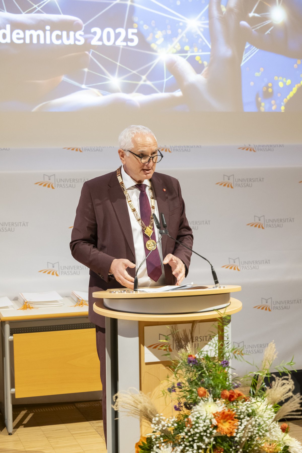 Nach dem Ortwechsel ins Audimax und Grußworten von Ministerialdirigent Dr. Michael Mihatsch und Alumni aus aller Welt ergriff Bartosch selbst das Wort. Für ihn, der im April 2026 aus dem Amt scheidet, war es der letzte Dies Academicus als Präsident der Universität Passau: „Es ist etwas sehr Besonderes, heute hier vor Ihnen zu stehen, ein letztes Mal mit dieser Amtskette, die ich für Sie alle trage – und es ist mir eine Ehre. Lassen Sie uns unseren Jahrestag mit Freude und Zuversicht, die gerade in diesen Zeiten so wichtig sind, gemeinsam feiern!“
