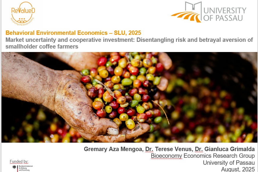 Gremary Aza Mengoa participated in the PhD Course+workshop on Behavioral Environmental Economics 2025, organised by the Swedish University of Agricultural Sciences (SLU), Department of Forest Economics, Umeå, and Center for Environmental and Resource Economics, Umeå, Sweden. The event took place at Uppsala (campus SLU), between 18th and 22nd of August, 2025. Gremary presented the results of her project in Costa Rica: “ Market uncertainty and cooperative investment: Disentangling risk and betrayal aversion of smallholder coffee farmers ”. This study is carried on in collaboration with Dr. Terese Venus and Dr. Gianluca Grimalda.