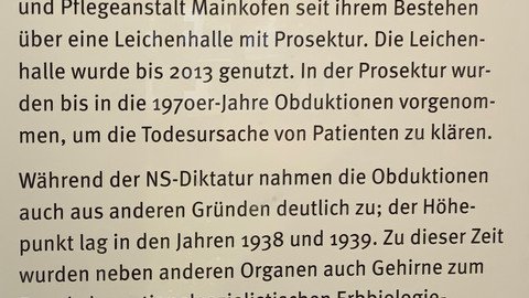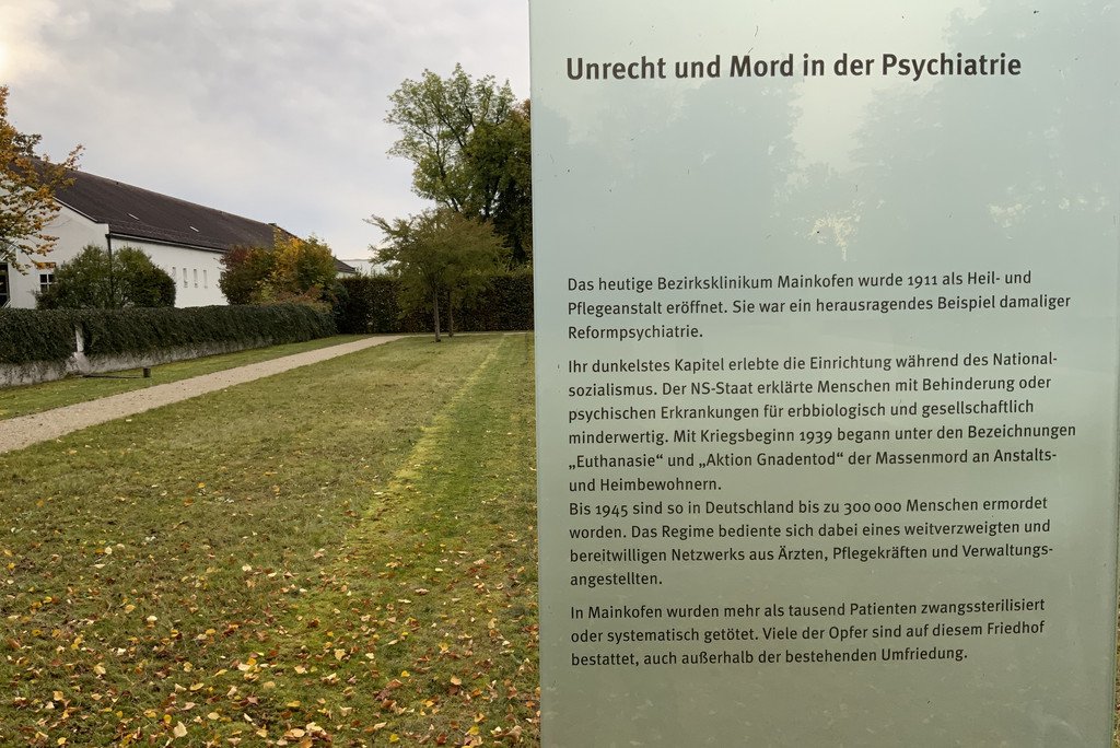 Ve vstupní části hřbitovního areálu poskytuje pět panelů informace o tom, co se dělo v Mainkofenu během éry národního socialismu. Témata „Nespravedlnost a vražda v psychiatrii“, „Nucená sterilizace“, „Akce „T4““ a „Decentralizovaná opatření k zabíjení“ jsou prezentována s pomocí smysluplných zdrojových materiálů. O desetiletích mlčení a zapomínání referuje panel „Vyrovnávání se s nacionálně socialistickým bezprávím po roce 1945“.
