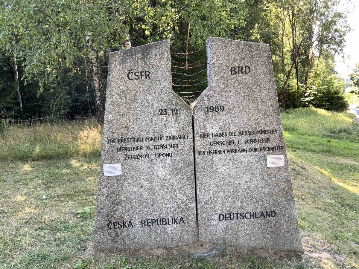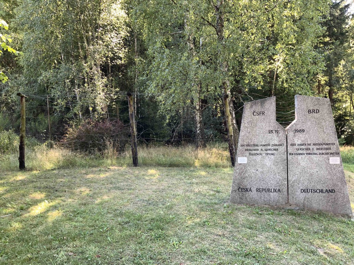 ČSFR / BRD / 23. 12. / 1989 / ZDE PŘESTŘIHLI MINISTŘI ZAHRANIČÍ / DIENSTBIER A GENSCHER / ŽELEZNOU OPONU / HIER HABEN DIE AUSSENMINISTER GENSCHER U. DIENSTBIER / DER EISERNEN VORHANG DURCHSCHNITTEN / ČESKÁ REPUBLIKA / DEUTSCHLAND