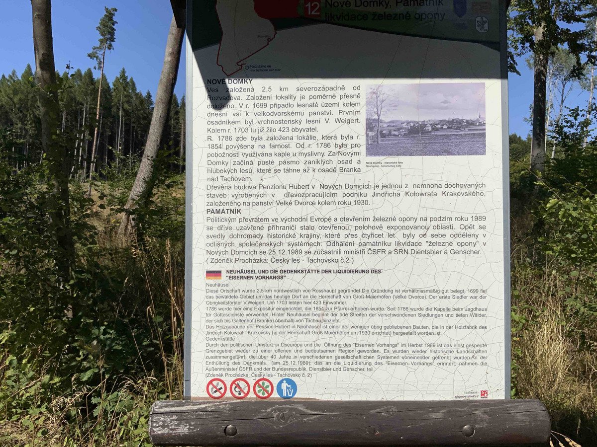 V obci Nové Domky nedaleko hraničního přechodu Rozvadov/Waidhaus, kde 23. prosince 1989 tehdejší ministři zahraničí Československa a Německa Jiří Dienstbier a Hans-Dietrich Genscher symbolicky přestřihli dráty železné opony, byl v roce 1993 odhalen malý pomník připomínající tuto událost. Jeho podobu navrhli tehdejší starostové Waidhausu a Rozvadova Gustl Reichenberger a Jindřich Červený.