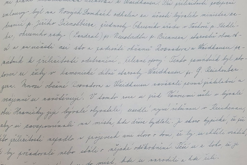 "Při příležitosti podepsání smlouvy byl na Nových Domkách odhalen za účasti bývalého ministra zahraničí p. Jiřího Dienstbiera, přednosty Okresního úřadu v Tachově p. Stehlíka, okresního rady (Landrat) Neustadtu p. Biennera, starostů obou obcí a za účasti asi sto a padesáti občanů Rozvadova a Waidhausu památník k příležitosti odstranění „železné opony“. Tento památník byl zhotoven ze žuly v kamenické dílně starosty Waidhausu p. G. Reichenbergera. Mnozí občané Rozvadova a Waidhausu navázali pevná přátelství a vzájemně se navštěvují. V tomto roce se před Vánocemi sešli v bývalé obci Hraničky její bývalí obyvatelé, usedlí nyní většinou v Reichenau, aby si zavzpomínali na místa, kde dříve bydleli. Je skoro typické, že při této příležitosti nepadlo v projevech ani slovo o tom, že by se chtěli vrátit, že by požadovali nebo stáli o nějaké odškodnění. Těší se z toho, že je jim umožněno podívat se do míst, kde se narodili a kde žili."