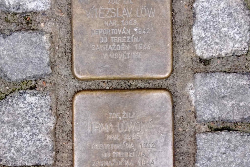 | ZDE ŽIL VÍTĚZSLAV LÖW NAR. 1895 DEPORTOVÁN 1942 DO TEREZÍNA ZAVRAŽDĚN 1944 V OSVĚTIMI | ZDE ŽILA IRMA LÖWOVÁ NAR. 1895 DEPORTOVÁNA 1942 DO TEREZÍNA ZAVRAŽDĚNA 1944 V OSVĚTIMI |
