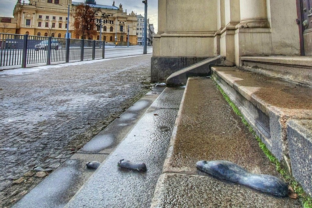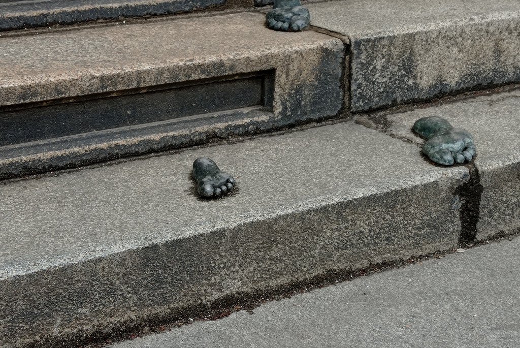 Pokud půjdete navštívit synagogu, nezapomeňte se podívat i na její schody, kde najdete drobnou plastiku Šlépěje tematizující plzeňské transporty.