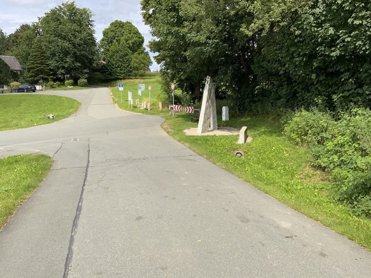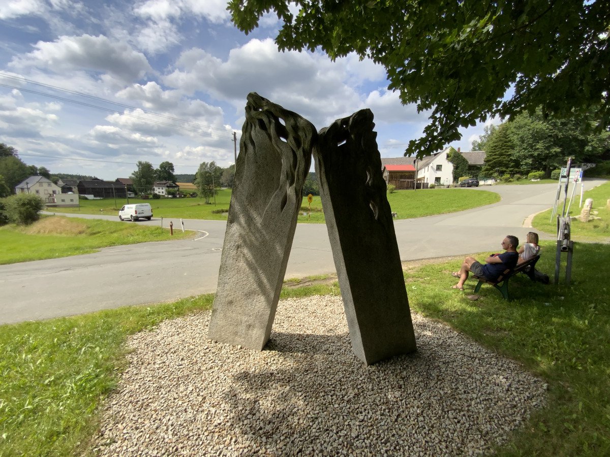 Die Skulptur Wiederfindung befindet sich in Neuhausen (Nové Domy), einem Ortsteil von Rehau in Oberfranken am Grenzübergang für Wanderer und Radfahrer nach Krásná (Schönbach).