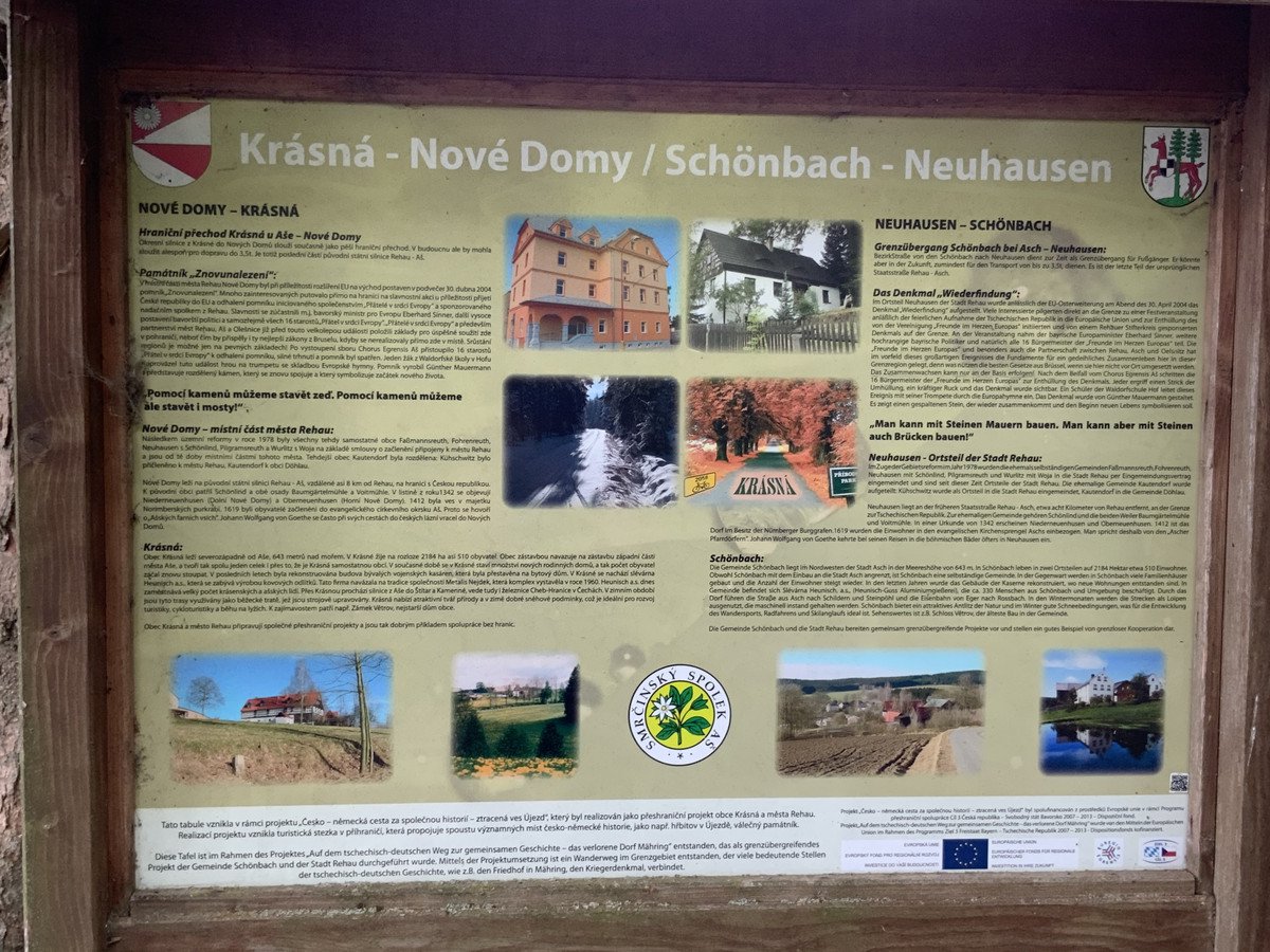 Als die Tschechische Republik ein Teil der Europäischen Union werden sollte, kam die Idee auf, diesem großen Ereignis ein Denkmal zu widmen. So entstand direkt neben dem Schlagbaum am Grenzübergang Neuhausen/Krásná die Skulptur "Wiederfindung". Diese soll erinnern an die gemeinsame Region, an die Teilung während der Zeit des Eisernen Vorhanges und vor allem an die Wiedervereinigung nach der Sanftenen Revolution 1989/90.