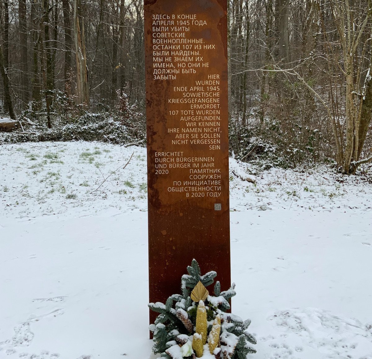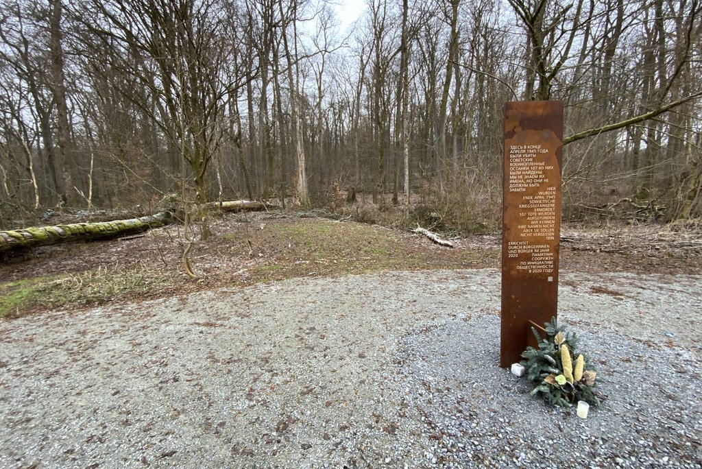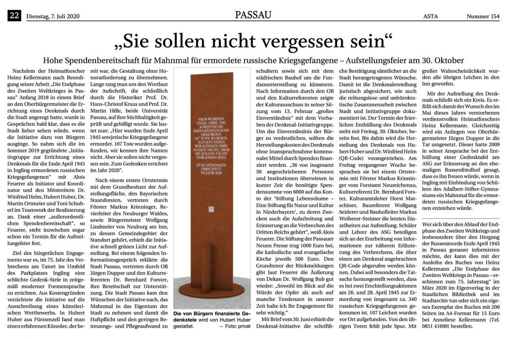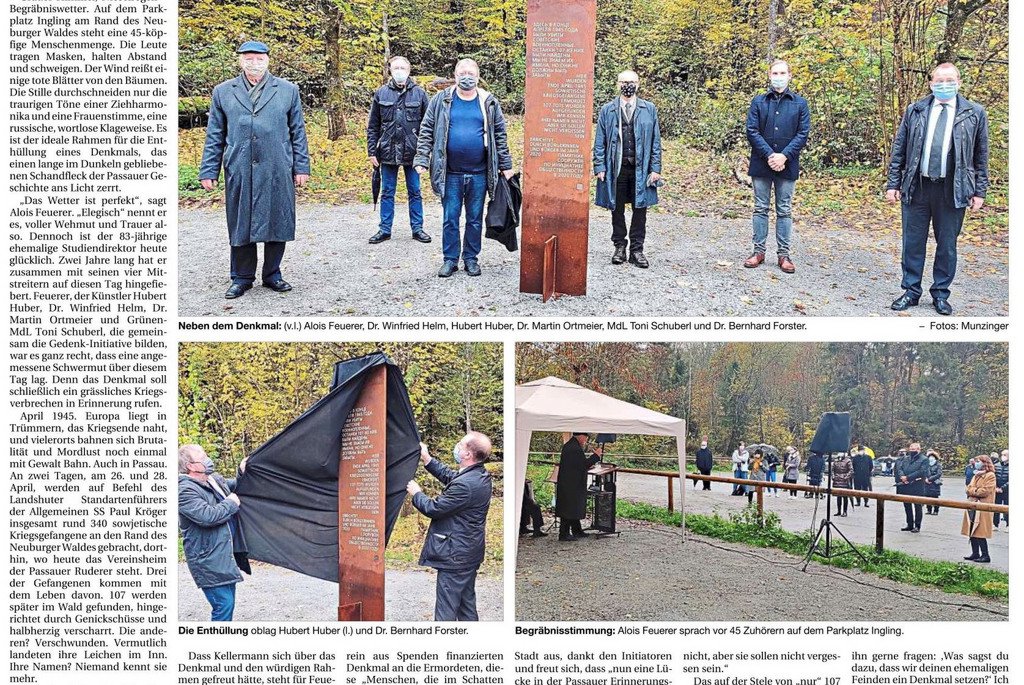 Einer Bürgerinitiative verdanken wir das Denkmal für die ermordeten russischen Männer am Ort des Geschehens. Die Errichtung dieses Mahnmals hatte erstmals der Passauer Geschichtsforscher Heinz Kellermann in einem Brief an den Oberbürgermeister angeregt.