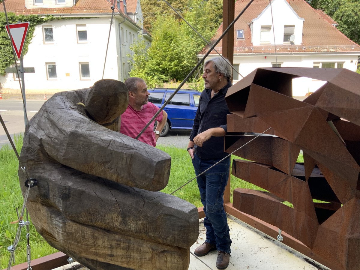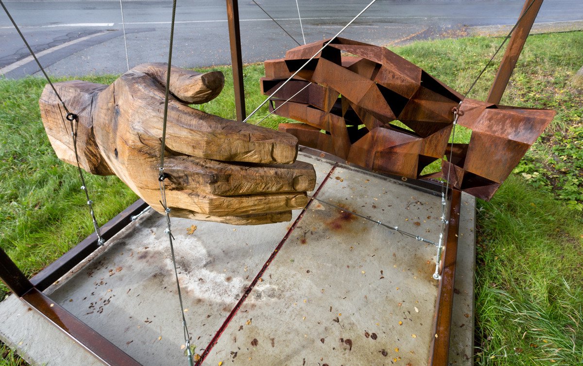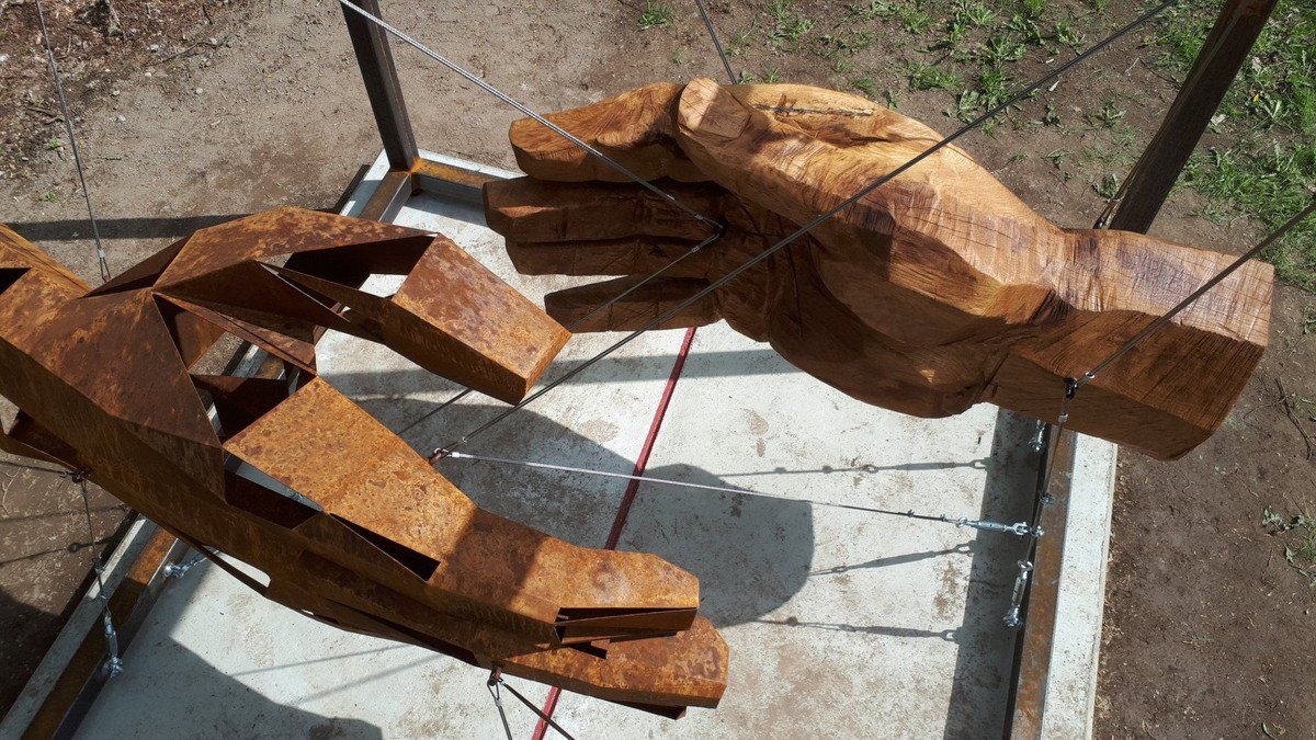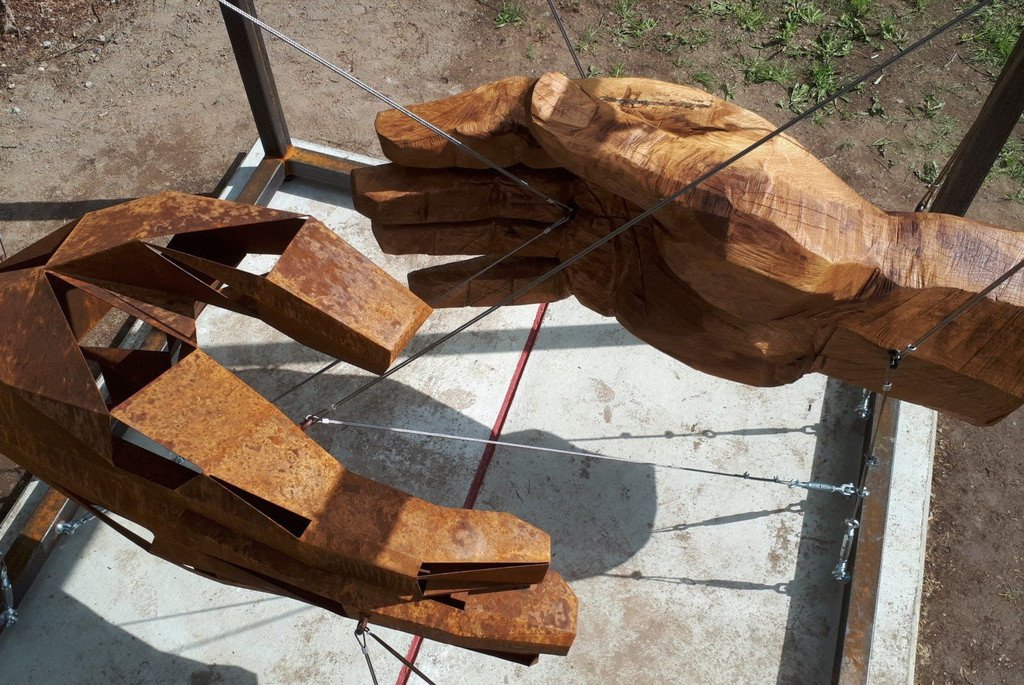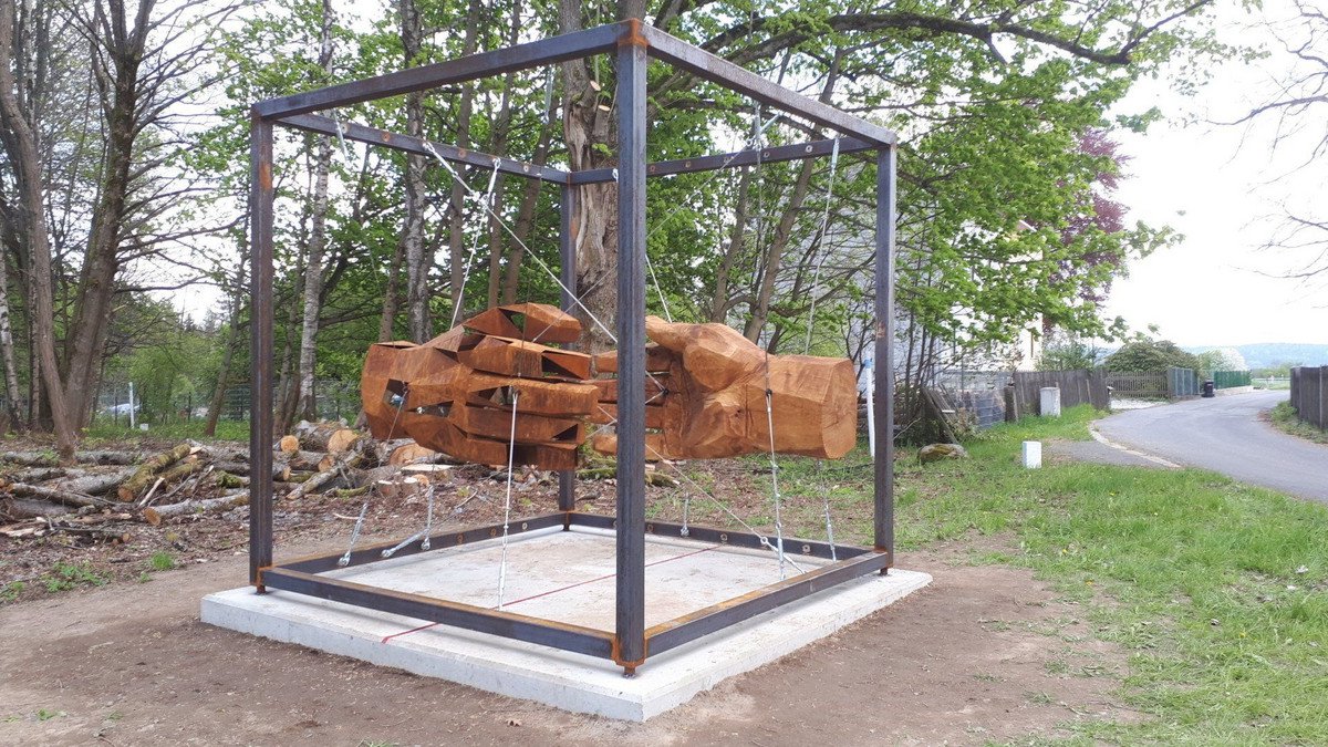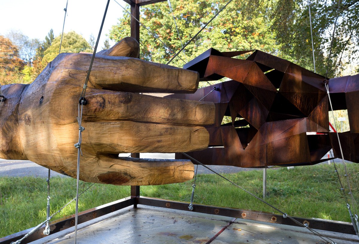 Die beiden Bildhauer Tomáš Dolejš aus Karlovy Vary und Wolfgang Stefan aus Selb oder Vohenstrauß haben gemeinsam das Werk aus zwei Teilen geschaffen. Die Vorgabe des Projektinitiators Jochen Goller war, dass die beiden Hände in einem 3x3x3m großen Kubus Platz finden müssen.
