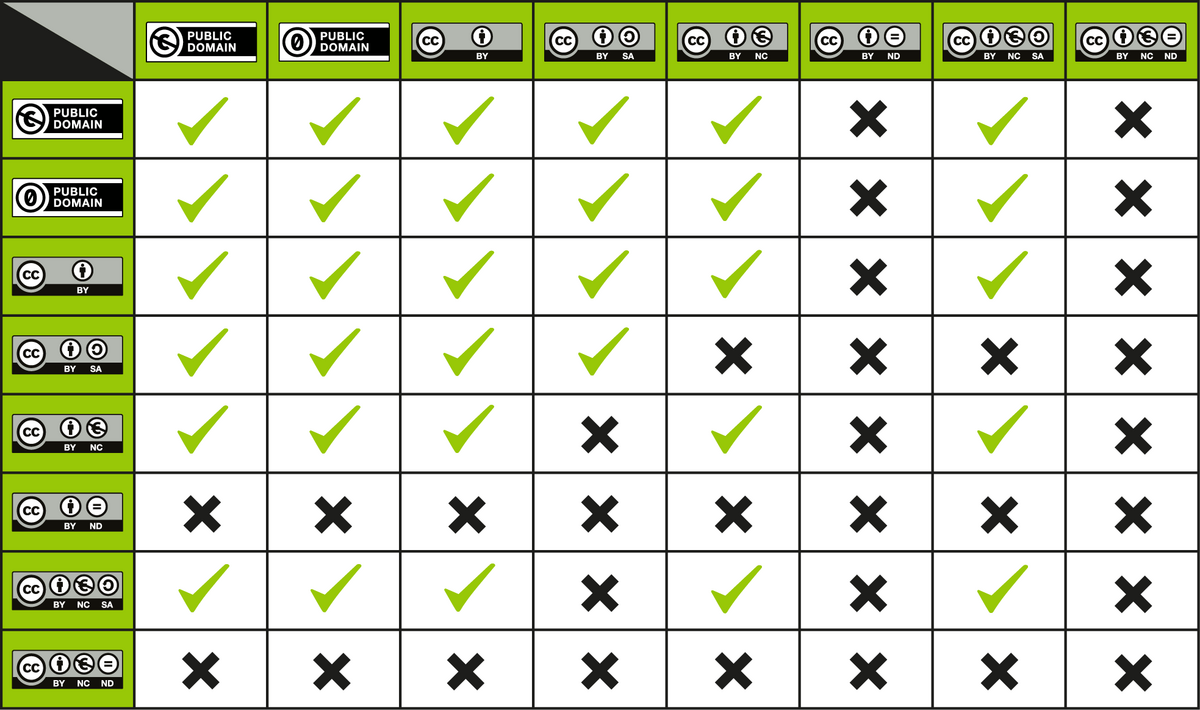 You can recognise OER by their open licences, usually Creative Commons (CC). Pay attention to the abbreviations, as these determine how you are permitted to use the material. Due to the requirements regarding openness in terms of commercial use and permission to adapt the material, only CC0, CC BY and CC BY-SA are considered OER. For free software, comparable licence types have been established (e.g. GNU, MIT), which serve as models for the CC licences.