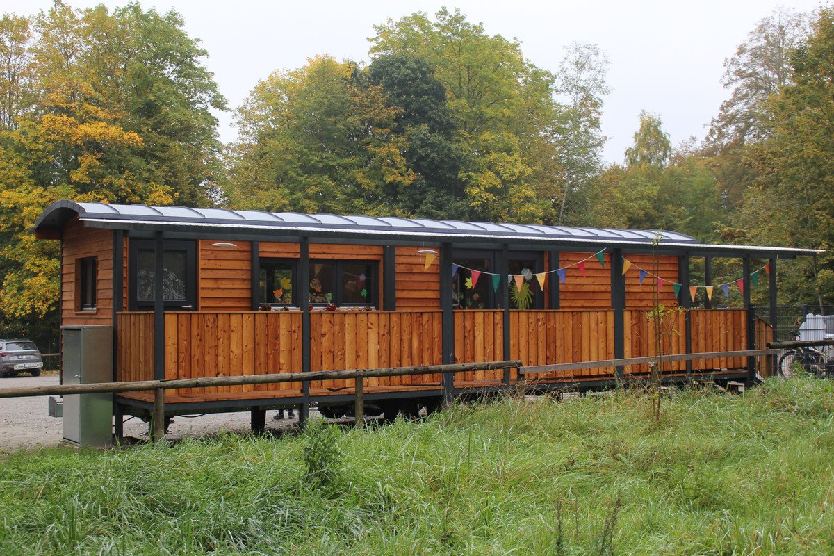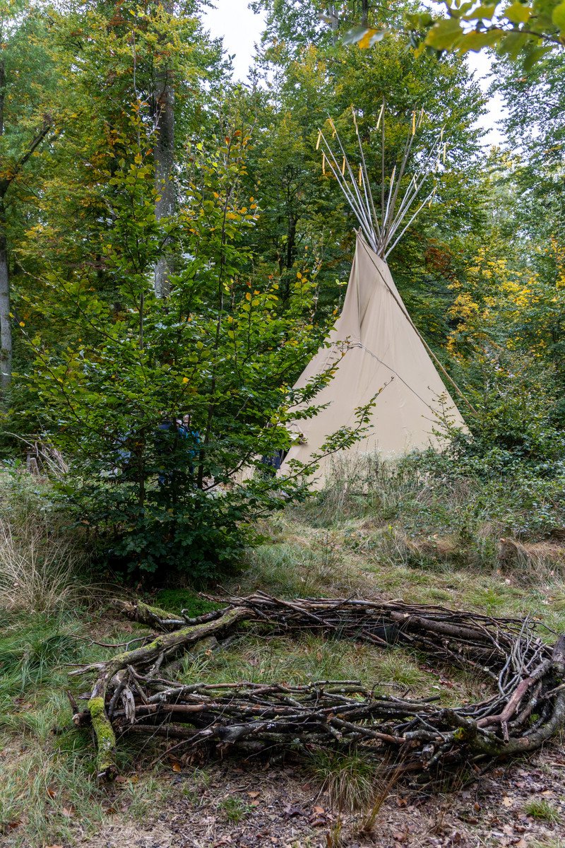 Dort steht der Kindergartenwagen, der durch ein zusätzliches Tipi auf einer Lichtung im Neuburger Wald ergänzt wird.