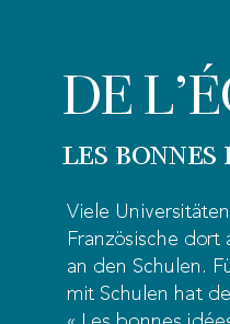 De nombreuses universités ont mis en place des initiatives pour faire prospérer le français là où il prend racine: dans les écoles. Pour récompenser les meilleures idées en matière de coopération avec les établissements scolaires, l'Association allemande des francoromanistes a de nouveau instauré le prix Les bonnes idées, doté de 500 euros. Les initiatives sélectionnées seront présentées à Passau, et les lauréats seront récompensés.
