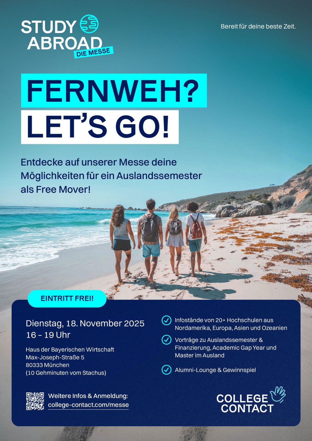 Interessieren Sie sich für ein selbst organisiertes Auslandssemester als Freemover? Dann haben wir einen Veranstaltungstipp für Sie: Am Dienstag, den 18. November veranstaltet die Beratungs- und Vermittlungsorganisation College Contact erneut ihre große „Study Abroad“-Messe in München.