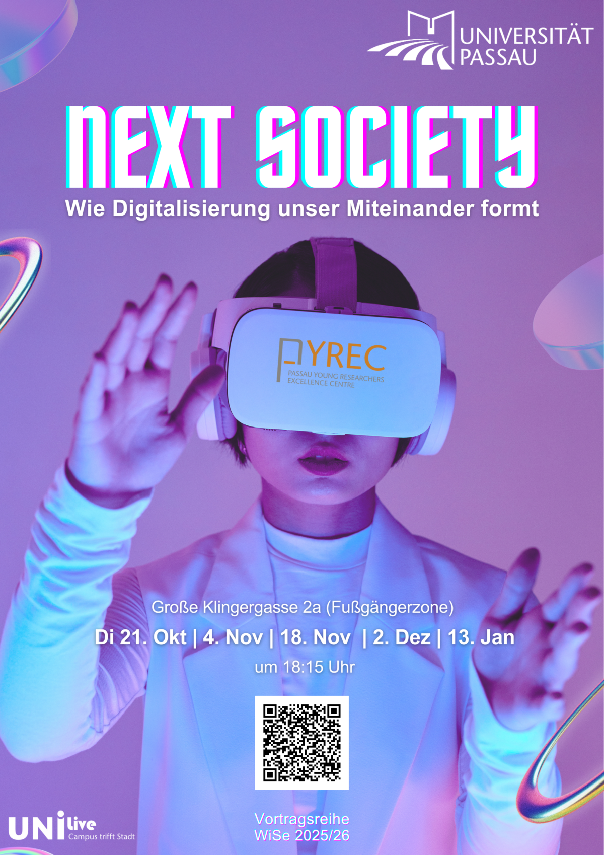 Die PYREC Arbeitsgruppe Gesellschaft-Digitalisierung organisiert im Wintersemester 2025/26 eine interdisziplinäre Vortragsreihe mit dem Titel „Next Society: Wie Digitalisierung unser Miteinander formt.“
